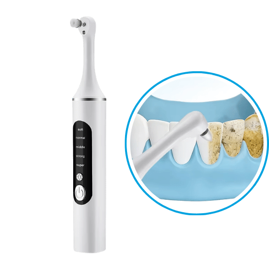 With an adjustable range of 5 intensity modes and an ultrasonic vibration system of up to 12,000 vibrations/min, it offers maximum precision in every procedure. Its compact and wireless design makes it easy to use in any position. Thanks to its 5 interchangeable stainless steel tips included, it is compatible with all types of dental cleaning — from light plaque deposits to stubborn tartar, coffee, and tobacco stains. It is the most complete device on the market.