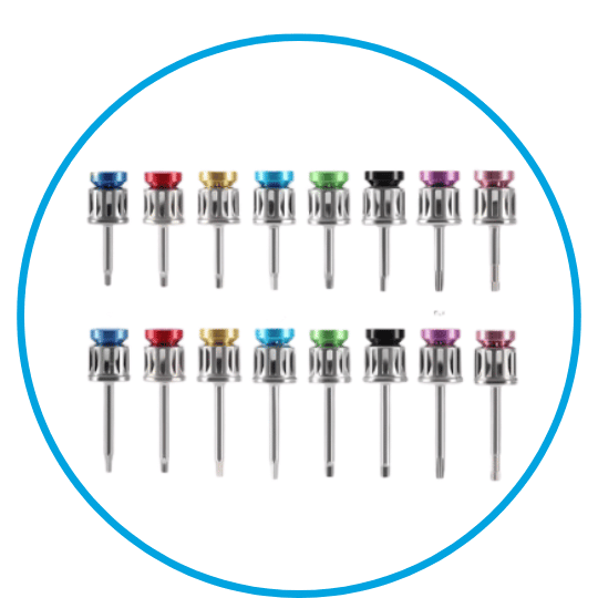 Complete set of 16 tips (drivers) in long and short versions, with sizes 1.0, 1.19, 1.2, 1.25, 1.27, 1.4, T-5, and T-6, offering compatibility and versatility for different implant systems.