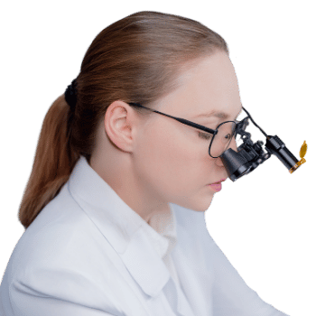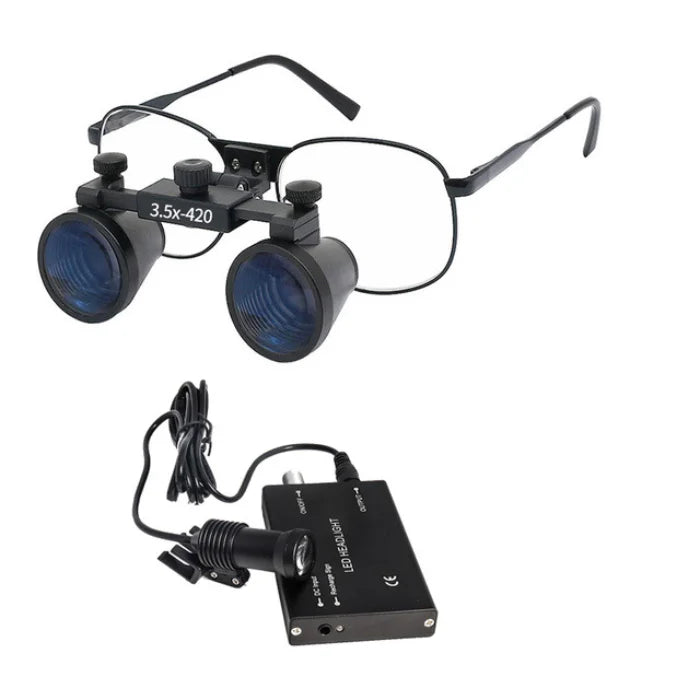 Glass lenses with 2.5x or 3.5x magnification and focal length of 30 to 42 centimeters.